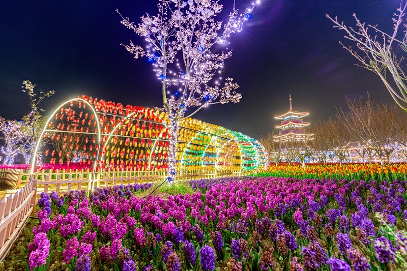벚꽃광장 앞의 벚꽃 수림에는 15만 그루의 각양각색 튤립과 히아신스들이 만개합니다. 튤립은 백합과 다년생 초본 식물로 품종이 다양하고 꽃색상이 각이하며 화려하고 아름답습니다. 매년 3~4월의 개화기에 이 곳의 튤립과 벚꽃이 어우러져 천하 절경을 자랑합니다.